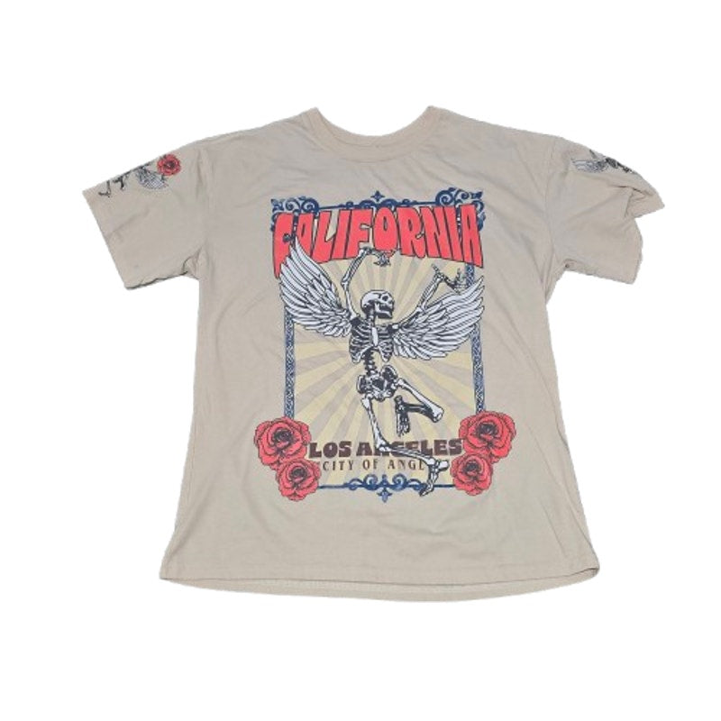 Make a bold statement with this edgy California graphic tee from Weekend Warrior. Featuring a winged skeleton clutching a rose with “Los Angeles – City of Angels” printed below, this beige shirt captures West Coast streetwear energy with a gothic twist. Distressed vintage style meets modern urban fashion. Perfect for lovers of skull tees, LA street fashion, or graphic grunge. Size Large. Great condition.