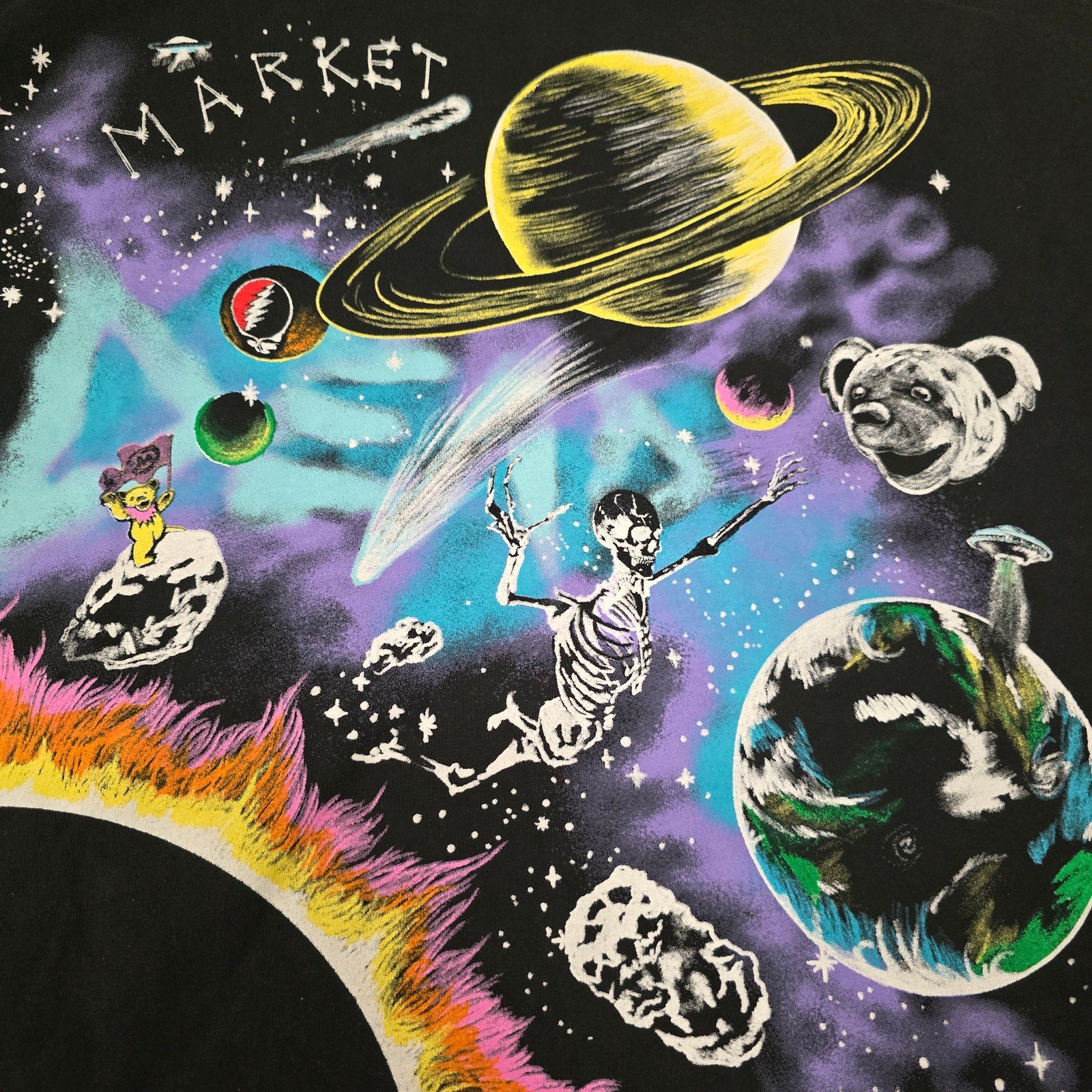 Grateful Dead cosmic tee with skeletons, bears, and trippy space art. Fire collab.